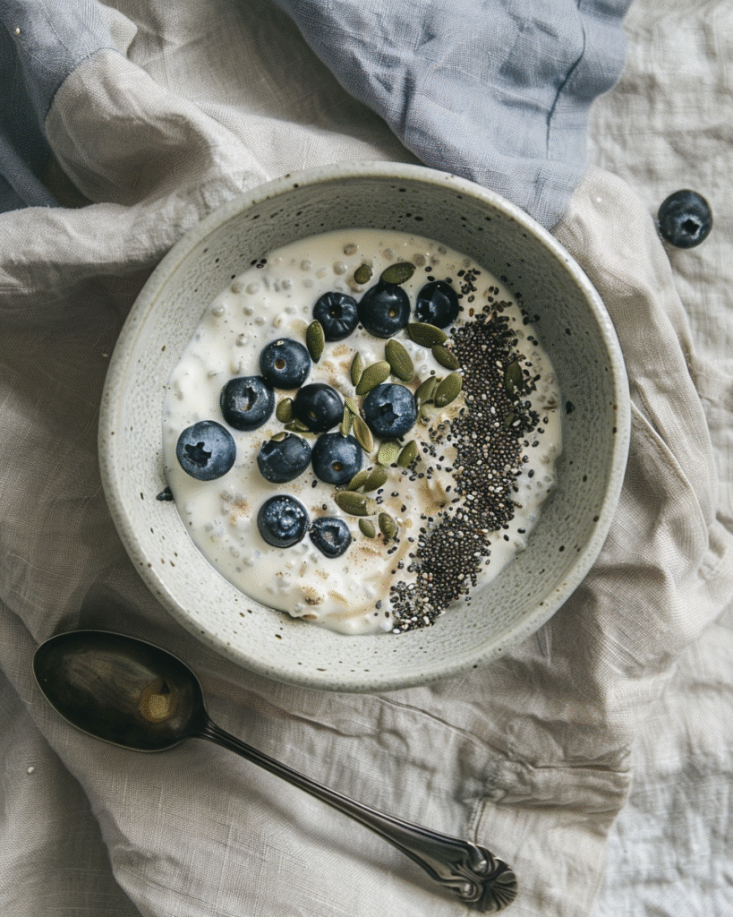 FODMAP-arme ontbijt bowl met haver, kokosyoghurt en blauwe bessen