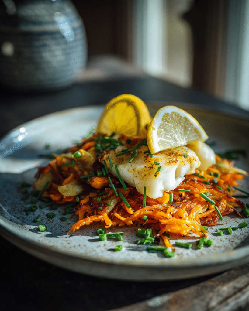 Heerlijk winters comfort food zonder gedoe: knapperige pompoen-wortelrösti met sappige kabeljauw, frisse citroen en bieslook. FODMAP-arm (flespompoen in portiecontrole), zónder ui of knoflookstukjes — wél volle smaak door knoflook-olie. In 40 minuten op tafel, perfect voor doordeweeks en toch feestelijk genoeg voor het weekend.