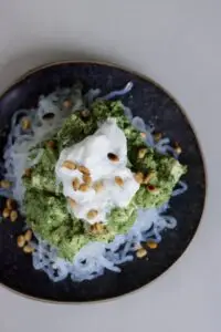 Deze heerlijke boekweitrisotto met aubergine en macadamiaroom biedt een verrassende combinatie van smaken en texturen. De romige notenroom en frisse citroen zorgen samen met de