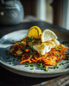 Heerlijk winters comfort food zonder gedoe: knapperige pompoen-wortelrösti met sappige kabeljauw, frisse citroen en bieslook. FODMAP-arm (flespompoen in portiecontrole), zónder ui of knoflookstukjes — wél